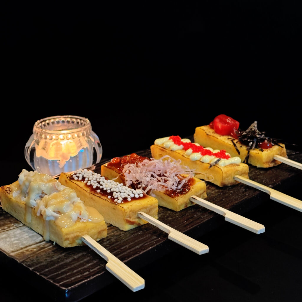 Japanese egg omelette served in eight perfect slices, topped with a rich miso mayo sauce